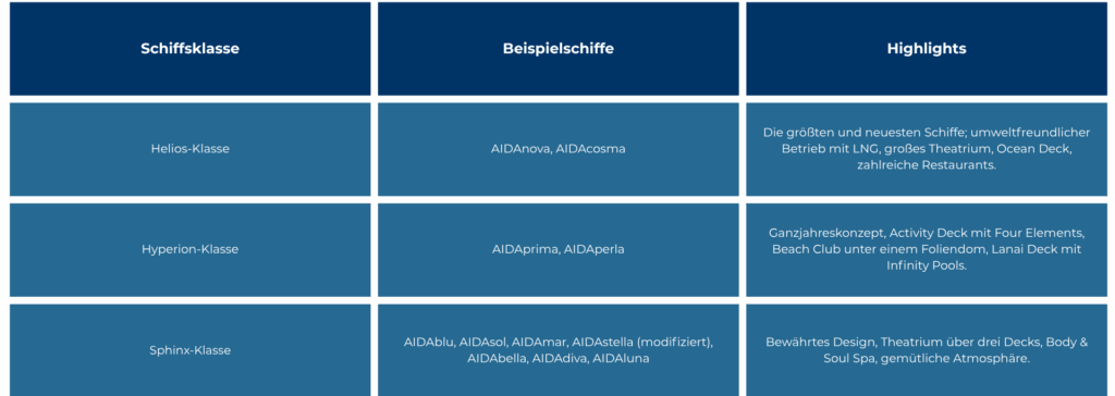 Die Flotte von AIDA besteht aus modernen und innovativen Schiffen, die sich in verschiedene Klassen unterteilen. Jedes Schiff hat seinen eigenen Charakter, aber alle bieten den gewohnten AIDA Komfort und Service.