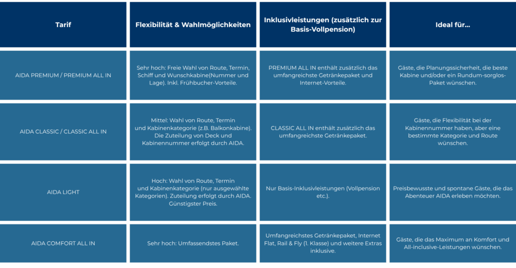 AIDA bietet verschiedene Tarife an, die sich in Leistungsumfang, Flexibilität und Preis unterscheiden. So finden Sie stets das Modell, das am besten zu Ihren Urlaubsbedürfnissen passt: